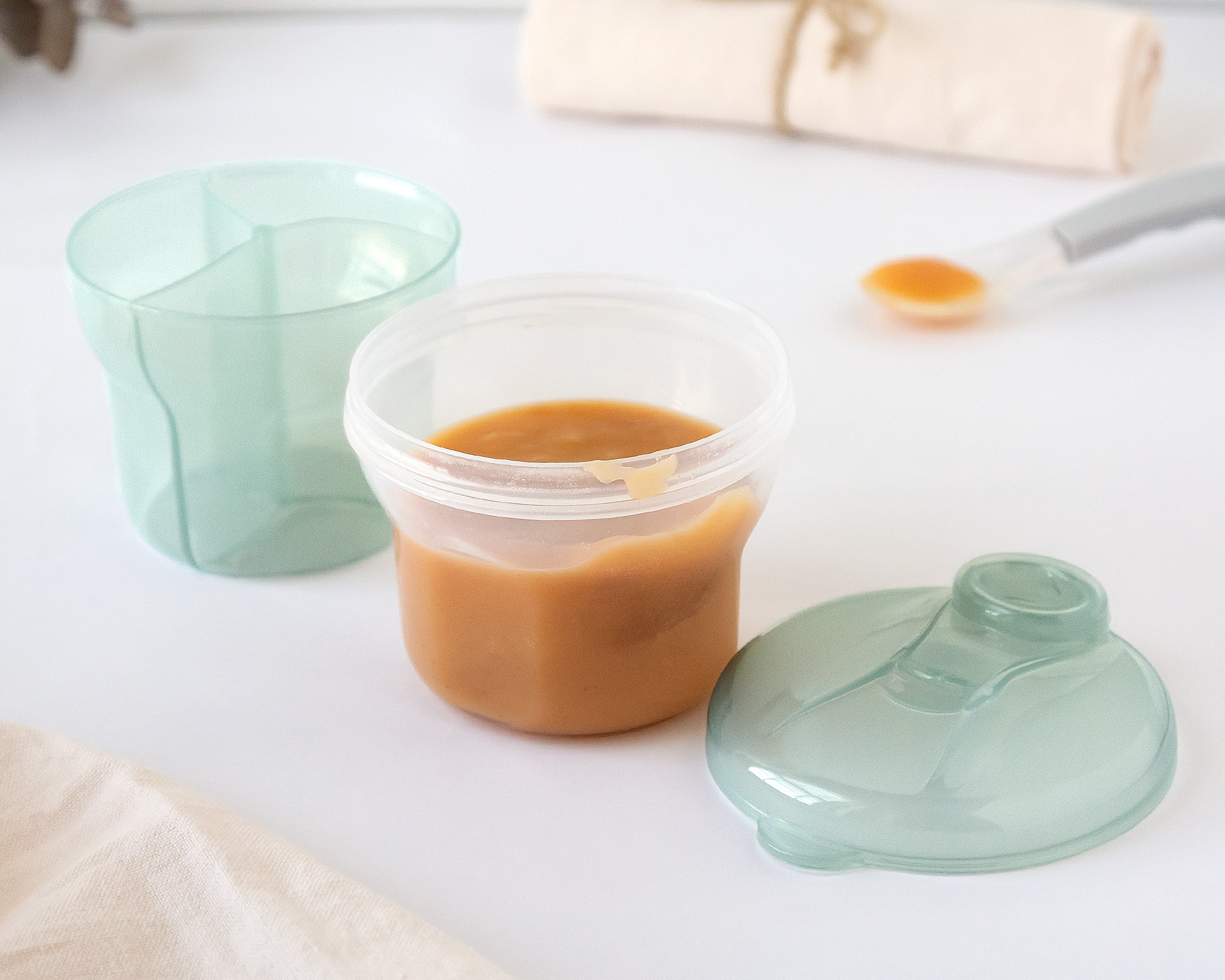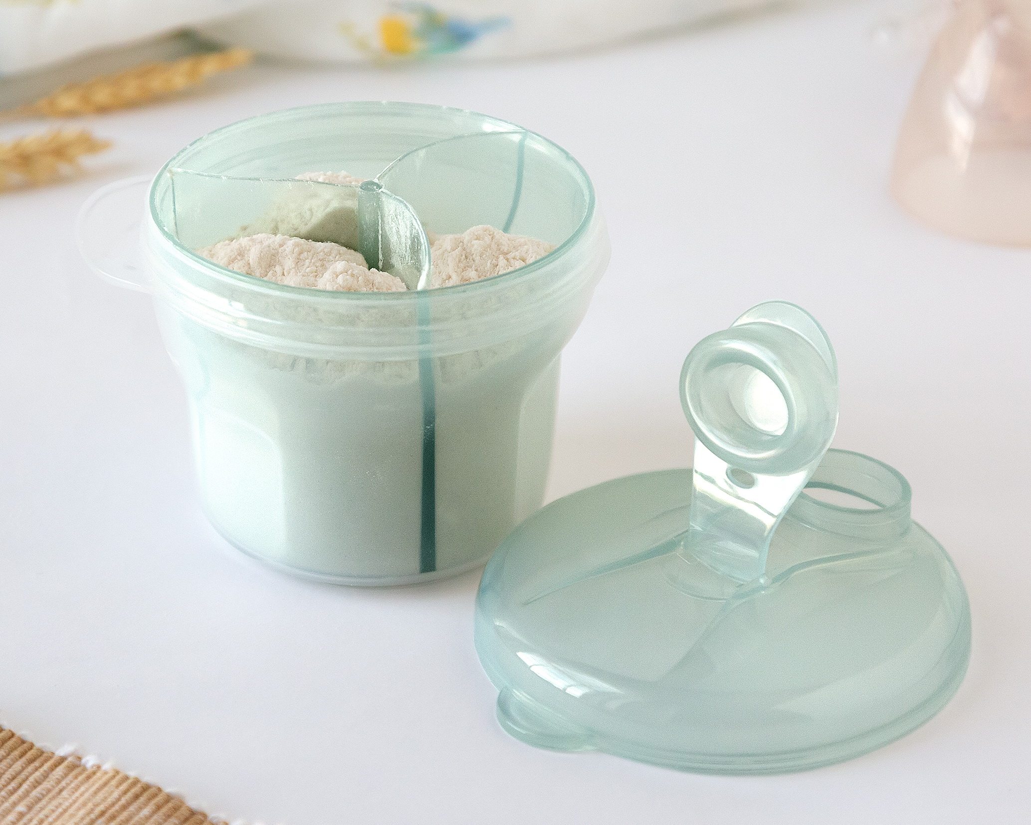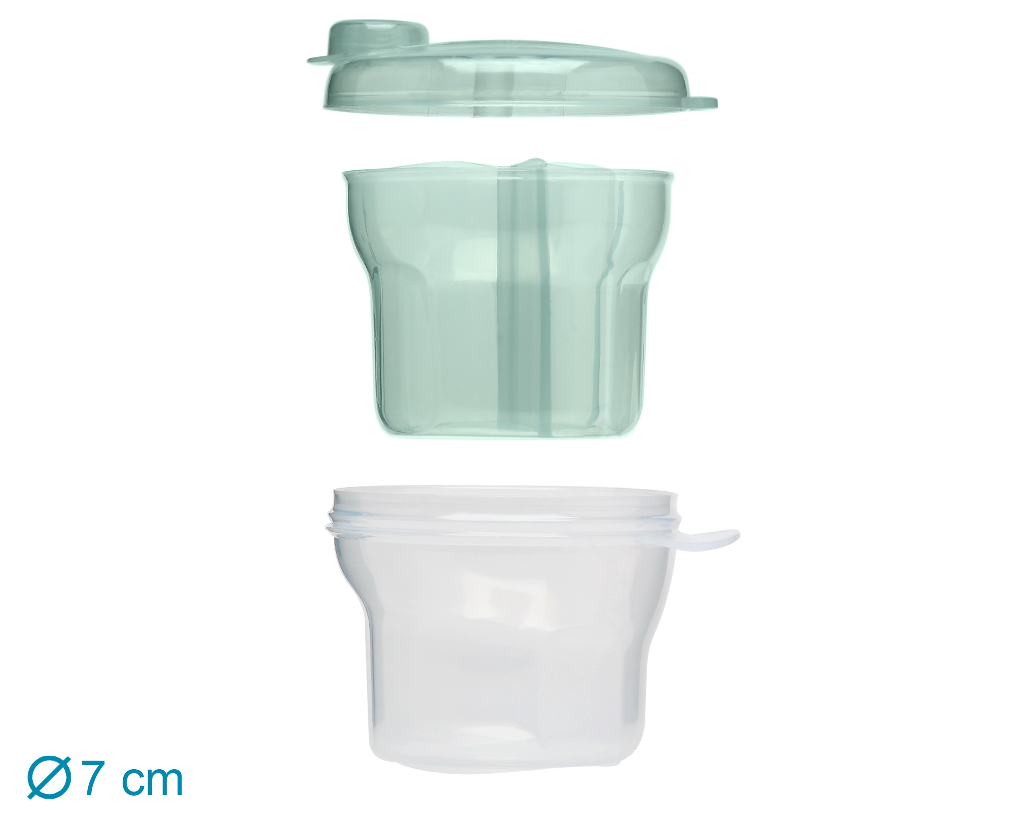 O doseador de leite em pó é obrigatório. É composto por 3 compartimentos semitransparentes, para que possamos ver o conteúdo de cada um deles sem ter que desparafusar. A tampa do recipiente é aparafusada e inclui uma pequena tampa que permitirá despejar o leite em pó diretamente na garrafa de forma fácil e rápida, bastando virar a tampa sobre o recipiente a ser esvaziado e despejá-lo na garrafa ou copo com o tampa descoberta. Pode até usar um dos compartimentos para transportar a chupeta do seu bebé, ou retirar a separação dos 3 compartimentos para convertê-la num maior para potes, frutas ou lanches. É recomendado para bebés +0 meses. Lavar antes e depois de cada uso com água limpa e sabão. · Pode ser lavado na máquina de lavar louça. Ao colocá-lo na máquina de lavar louça, use apenas a bandeja superior. Não utilize produtos abrasivos ou solventes. Adequado para esterilizador. Certifique-se de que esteja seco e limpo para evitar fungos.