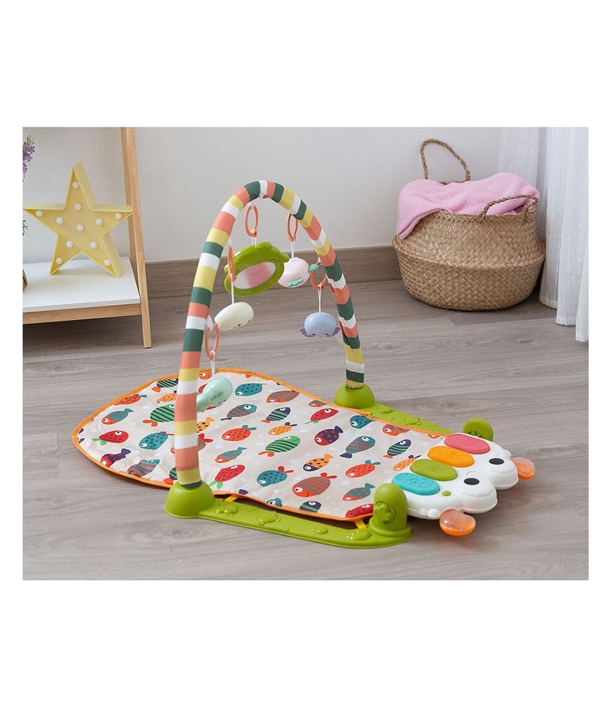 O tapete/manta de atividades mais divertido e didático. Este tapete/manta é composto por arco e piano para que o bebé possa divertir-se deitado nele. Quando estiver deitado você pode tocar as teclas do piano com os pés e ao mesmo tempo fazer exercícios. É um tapete muito completo e divertido pois possui 4 posições para tocar. Pode ser usado como manta, com ou sem arco de atividade. Toca 5 melodias diferentes e inclui 4 chocalhos suspensos e um espelho.